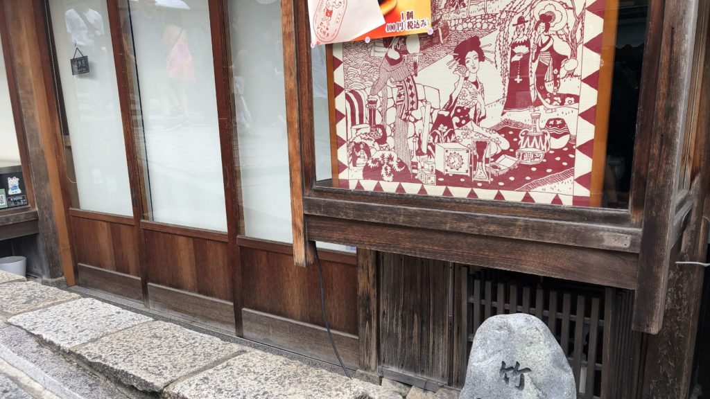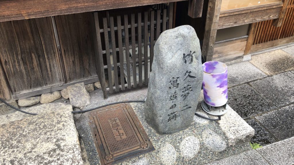 かさぎ屋の隣には、「竹久夢二寓居の跡」という石碑が建っています。大正時代の画家・竹久夢二は、情緒ある美人画を多く描いた人。30代前半に一時期京都に住んでおり、かさぎ屋の横に居住していました。